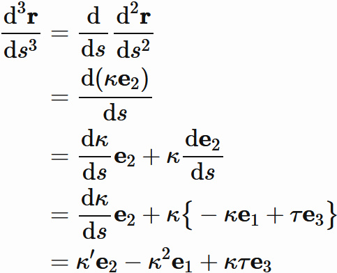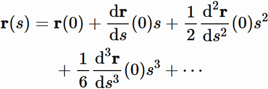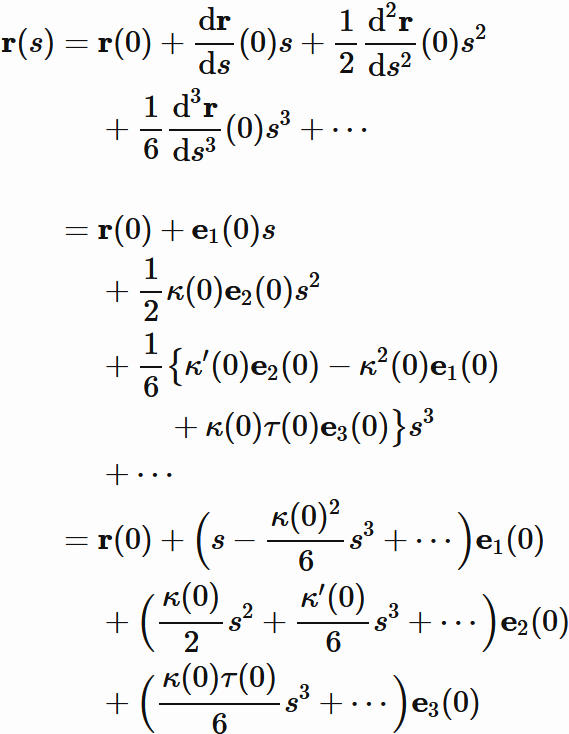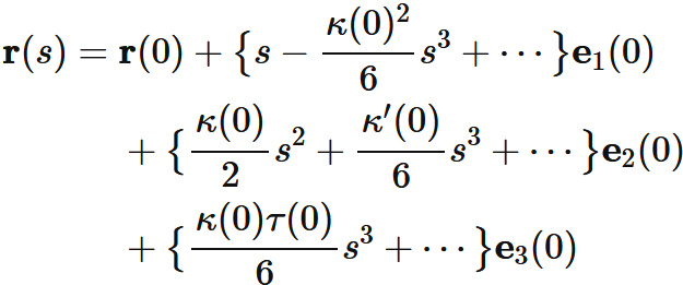 &&+ \big\{ \frac{\kappa(0) \tau(0)}{6}s^3 + \cdots \big\}\mathbf{e}_{3}(0)
