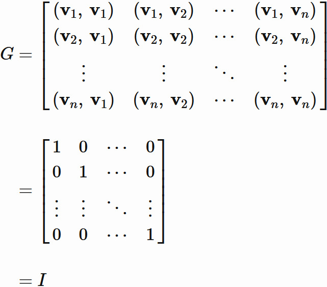 正規直交基底に対するグラム行列であるので単位行列である。