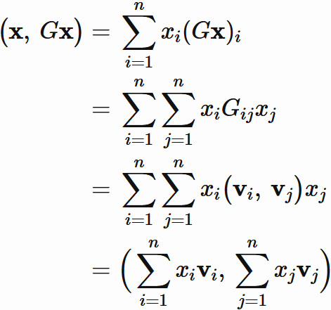 はグラム行列 $(2)$ の $i$ 行 $j$ 列成分である。そこで、