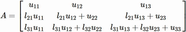 $L$ と $U$ の各成分をそれぞれ $l_{ij}$, $u_{ij}$ と表すと、