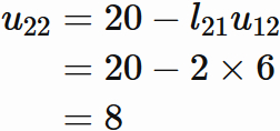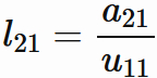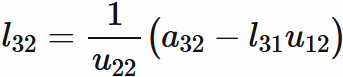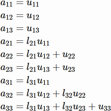 このように LU 分解された行列の各成分は1行目から(または1列目から)順番に連鎖式に値が求まって行く。
