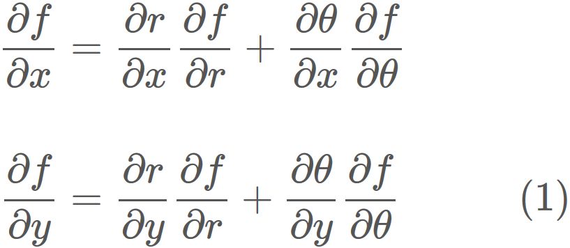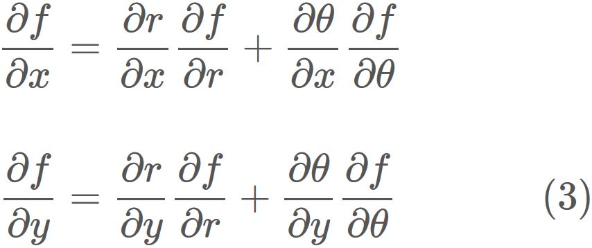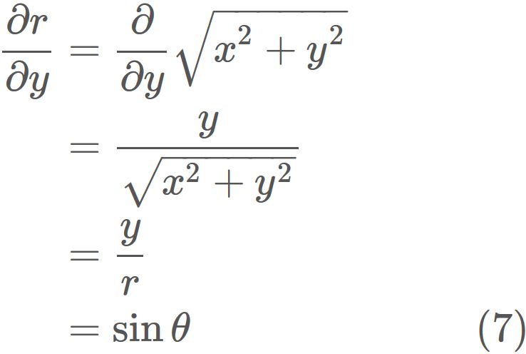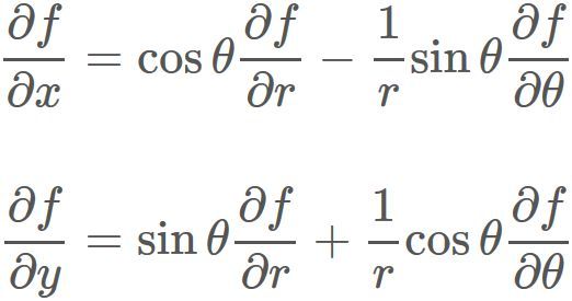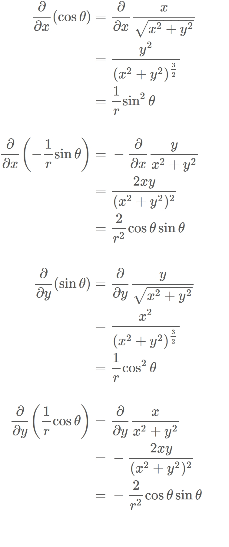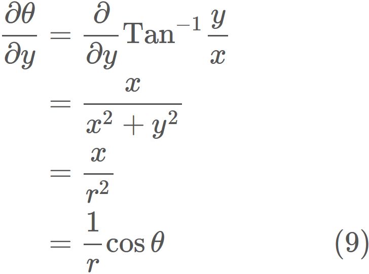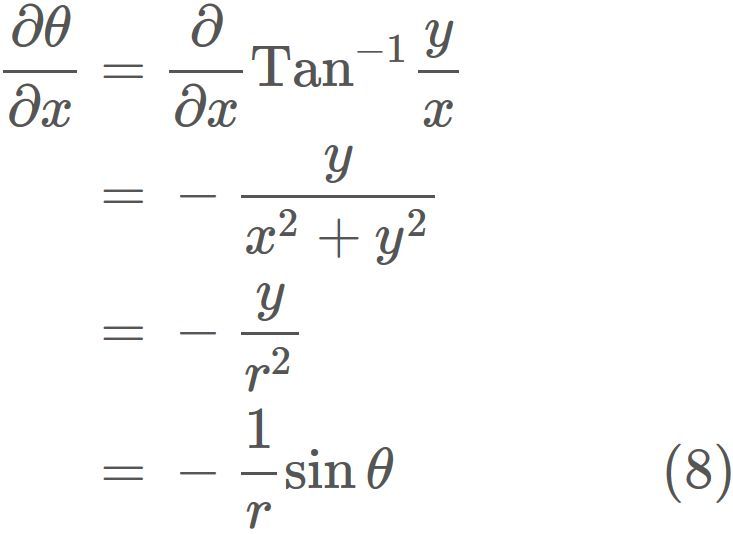この中の偏微分 $\frac{\partial r}{\partial x}, \frac{\partial \theta}{\partial x}, \frac{\partial r}{\partial y}, \frac{\partial \theta}{\partial y}$