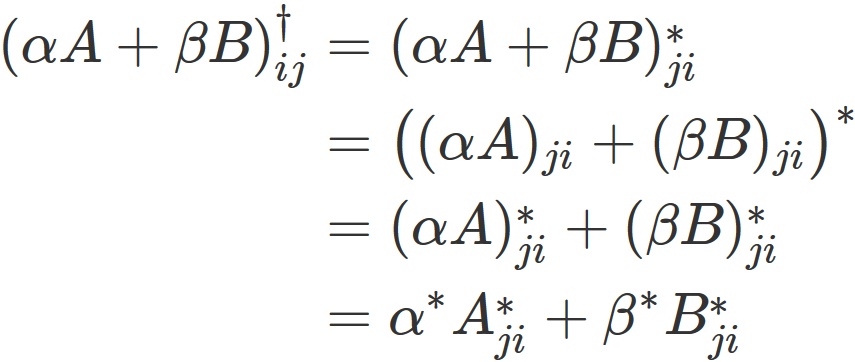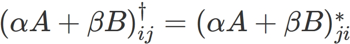 線形結合 $\alpha A + \beta B$ の成分 $(\alpha A + \beta B)^{\dagger}_{ij}$ も同様に