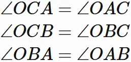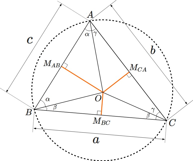 すなわち、線分 $OM_{CA}$ は 辺 $CA$ の垂直二等分線である。