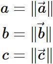 とする。また便宜上 $\vec{a}, \vec{b}, \vec{c}$ の長さ (ノルム) をそれぞれ