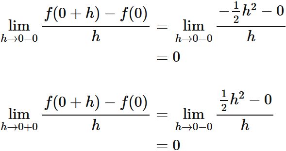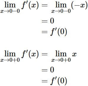 となり、左極限と右極限がともに $f'(0)$ になるので、