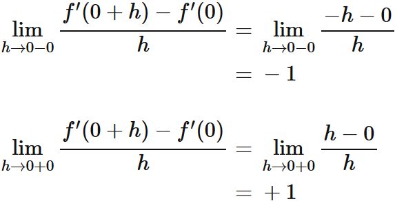 一方、$f'(x)$ の $x=0$ における微分の定義の左極限と右極限が