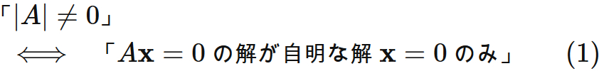 行列式が $0$ ではないことと、 同次連立一次方程式 $A \mathbf{x} = 0$ が自明な解のみを持つことは同値