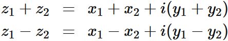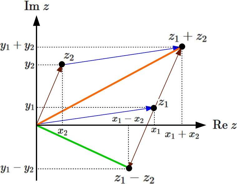 すなわち、和は二つの複素数をベクトルとして結んだ先に位置する。