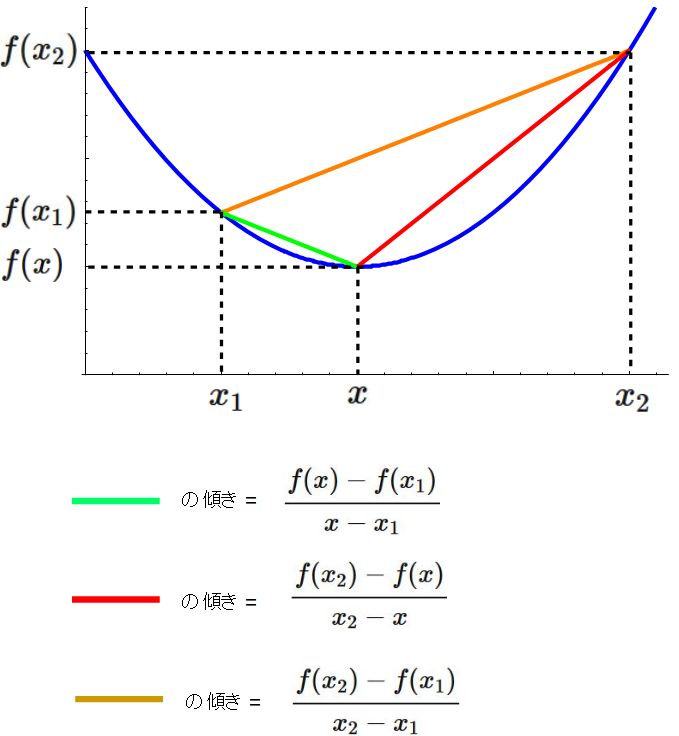 下に凸⇔3直線の傾きの関係を参考)。