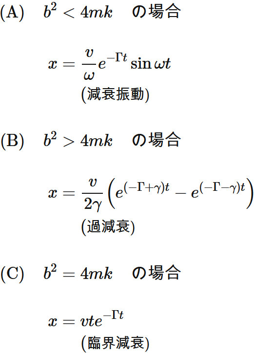 これらの3種類の運動のうち、物体が振動するものは $(\mathrm{A})$ の減衰振動のみである。
