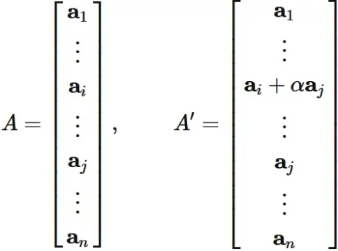 正方行列の任意の行に他の行の定数倍を加えても行列式は変わらない。