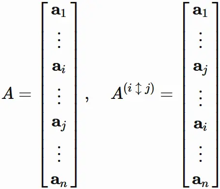 正方行列 $A$ の $i$ 行と $j$ 行を入れ替えた行列を $A^{(i\hspace{1mm} \updownarrow \hspace{1mm}j)}$ とすると、