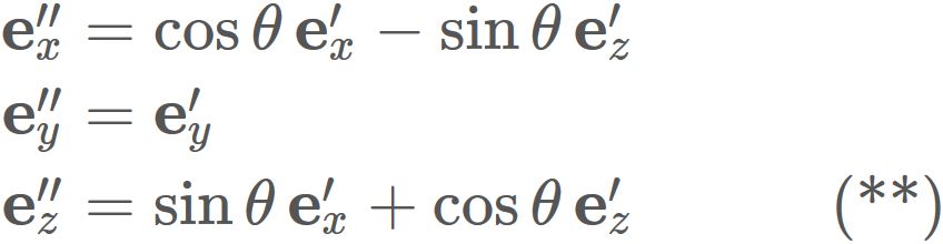また、回転後の正規直交基底 $\{ \mathbf{e}_{x}'', \mathbf{e}_{y}'', \mathbf{e}_{z}'' \}$ は、