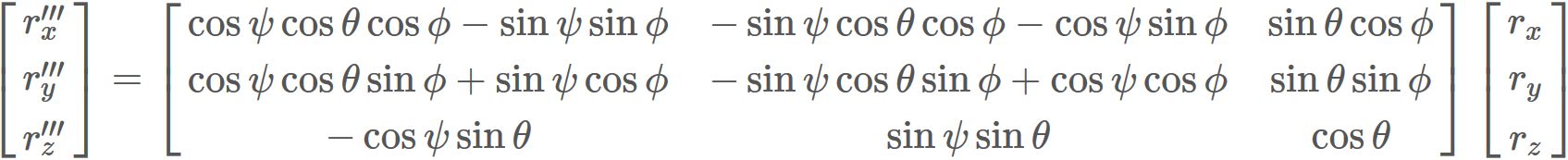 物体を座標系とともに $z$ 軸、$y$ 軸、$z$ 軸まわりの順にそれぞれ角度 $\phi$、$\theta$、$\psi$ だけ回転させたときに、