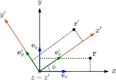 回転後の座標系 $C'$ は座標系 $C$ を $z$ 軸まわりに角度 $\phi$ だけ回転させて得られる座標系であり、