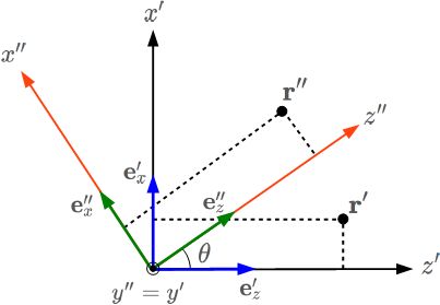 回転後の座標系 $C''$ は座標系 $C'$ を $y$ 軸まわりに角度 $\theta$ だけ回転させて得られる座標系であり、
