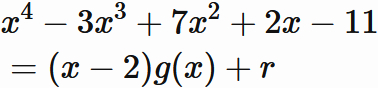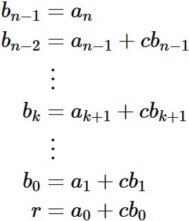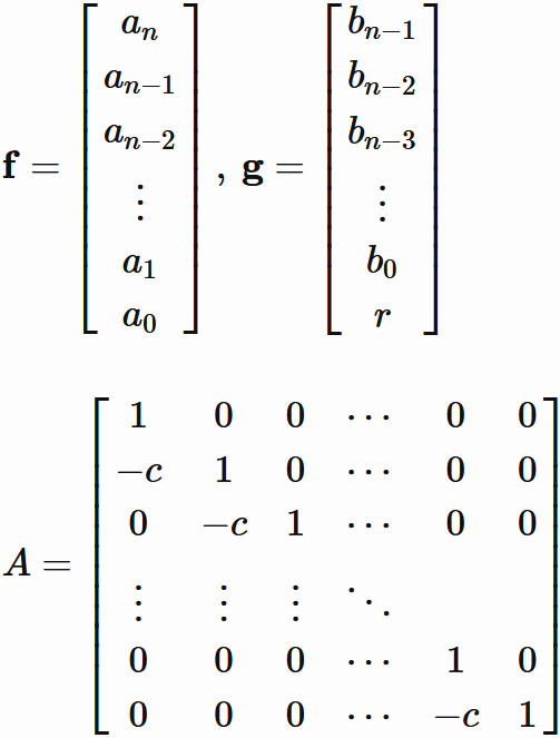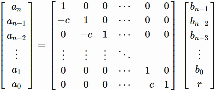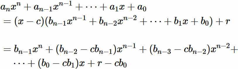 $n$ 次多項式 $f(x)$ を $x-c$ で割ったときの商 $g(x)$ と余り $r$ を求める方法である。
