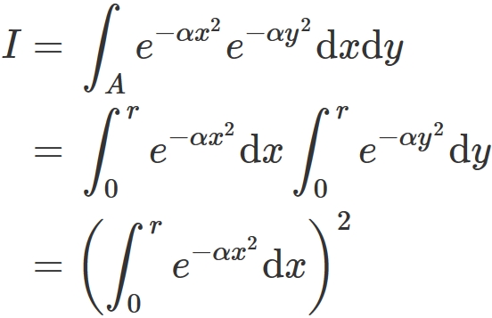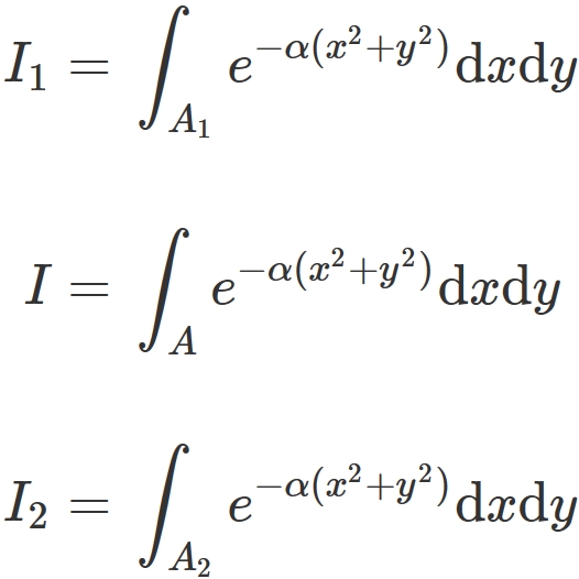 非積分関数を $e^{-\alpha (x^{2}+ y^{2})}$ とする積分をそれぞれ $I_{1}$, $I$, $I_{2}$ とする。