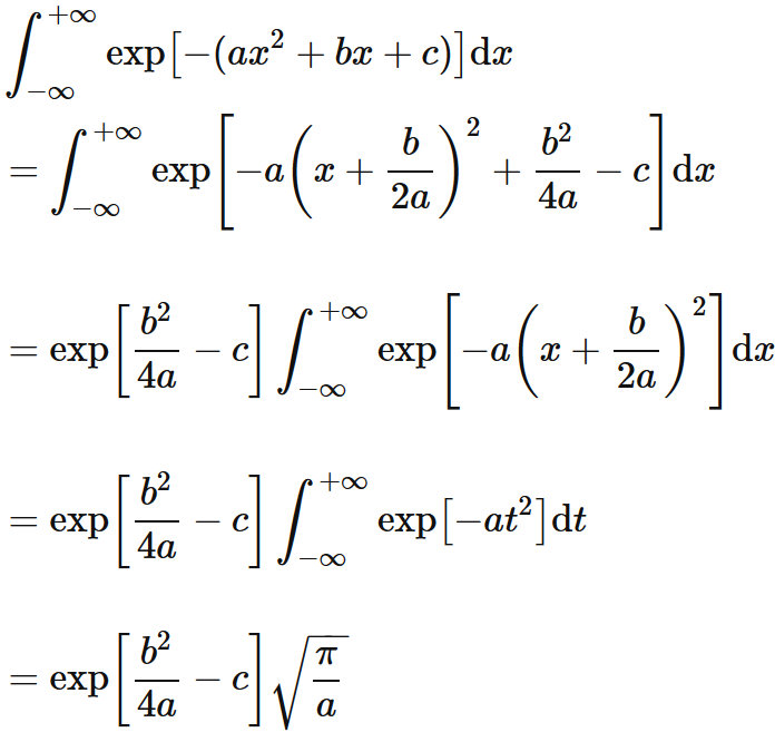 このように、ガウス積分の指数が二次関数の一般形になることはしばしば現れる