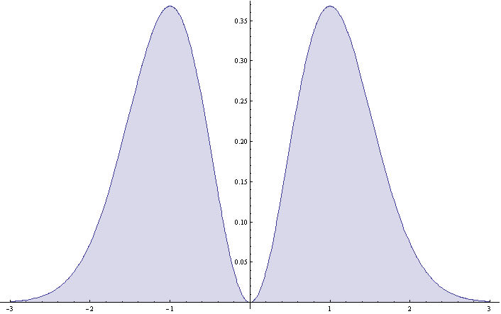 $- \infty$ から $0$ までの積分と $0$ から $+\infty$ までの積分に分けて考えるとよい。