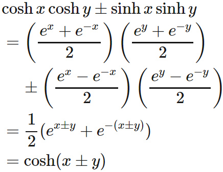 となる。最後の等式では $\cosh x \cosh y \geq 1$ であることを考慮して 分子分母を $\cosh x \cosh y $ で割った。