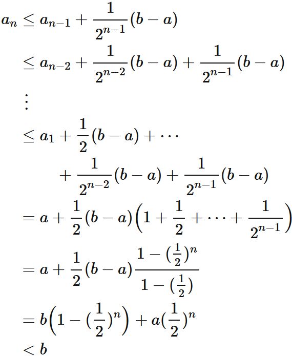 &=& \lim_{n \rightarrow \infty} \Big( a_{n} + \frac{1}{2^{n-1}}(b-a) \Big)