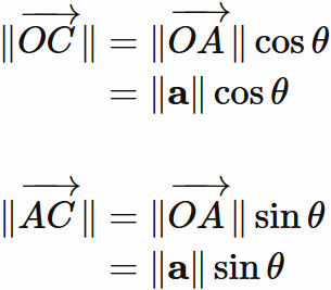 三角関数の定義から、辺 $OC$ と 辺 $AC$ の長さは、それぞれ