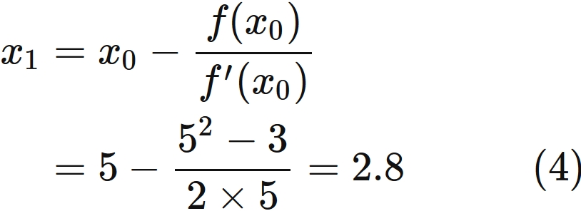 ここでは、$\sqrt{3}$ の値を求めるニュートン法がこれらの条件を満たすこと確かめよう。$x_{0}=5$ とすると、 $(1)$ より、