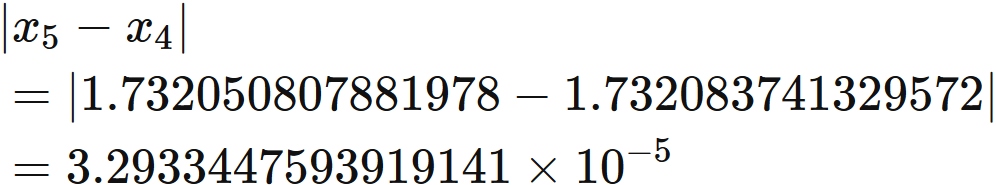 であるから、$x_{5}$ と $x_{4}$ の差の絶対値が $10^{-4}$ 以下になる。