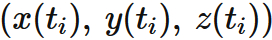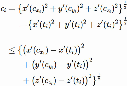 原点から点 $ (x'(t_{i}) , y'(t_{i}), z'(t_{i})) $ までの距離の差分である。