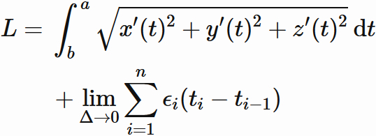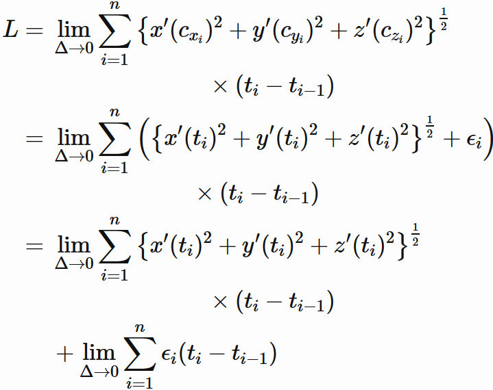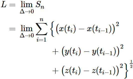 曲線上の点を結ぶ線分の総和の極限によって以下のように定義される。