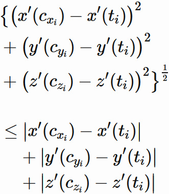 原点から点 $ (x'(c_{x_{i}}) , y'(c_{y_{i}}), z'(c_{z_{i}}) ) $ までの距離と