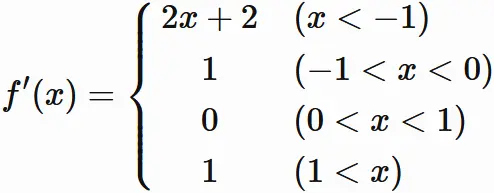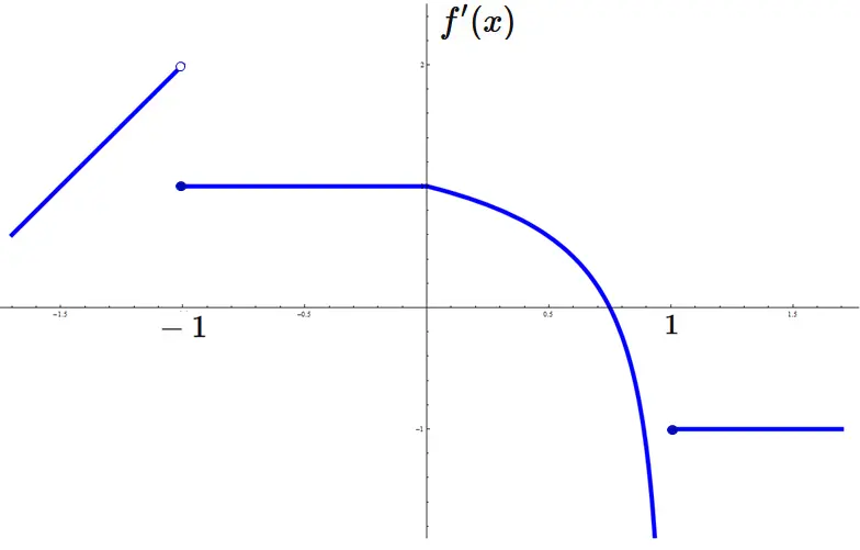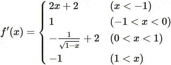 であり、$x=1$ において左微分係数が収束しないことが分かる (下図)。