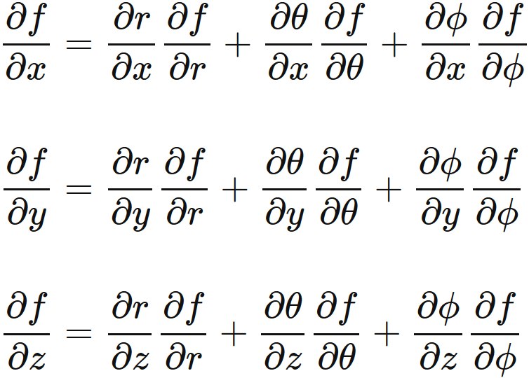 ここで表された3つの微分もまた極座標の関数であり、