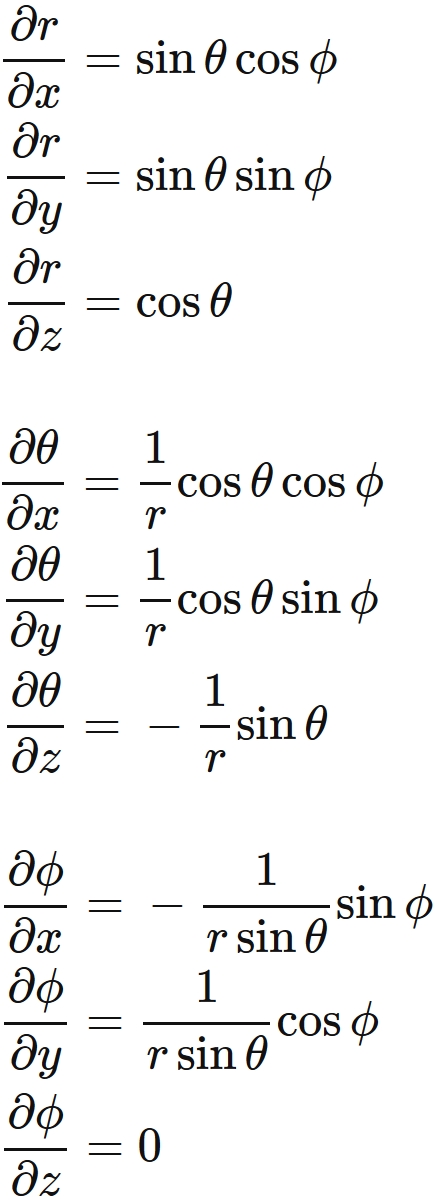 この式に含まれる極座標のデカルト座標による偏微分は、