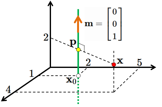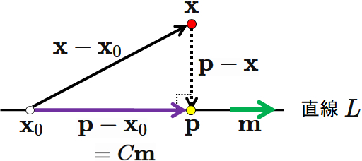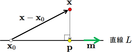 方向ベクトルが $\mathbf{m}$ である直線を $L$ とする。