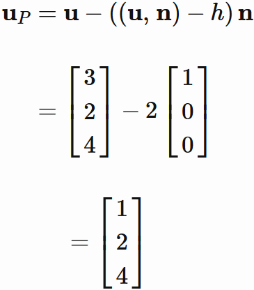 このとき、点 $U$ の平面 $P$ 上への投影点(垂線の足)の位置 $\mathbf{u}_{P}$ は、