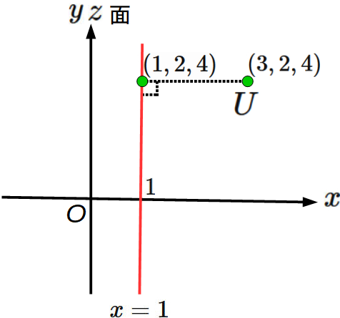 座標値が $(3,2,4)$ の点 $U$ の平面