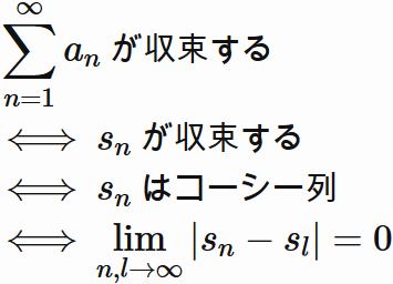 が収束することは、$\{ s_{n} \}$ がコーシー列であることと同値である。つまり、まとめると、