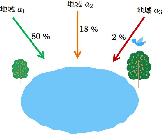 ある湖には三つの地域 $a_{1}, a_{2}, a_{3}$ から渡り鳥が飛来する。