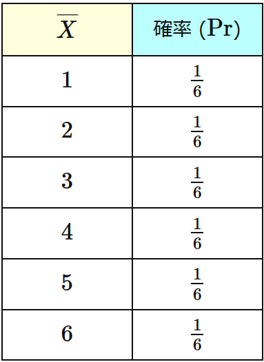 それぞれの出目が現れる確率は $\frac{1}{6}$ であるので、