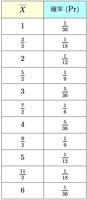 の $11$ 通りである。ここで、例えば、$\overline{X} = \frac{3}{2}$ となるのは、