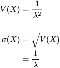 指数分布に従う確率変数 $X$ の分散 $V(X)$ と標準偏差 $\sigma(X)$ は、