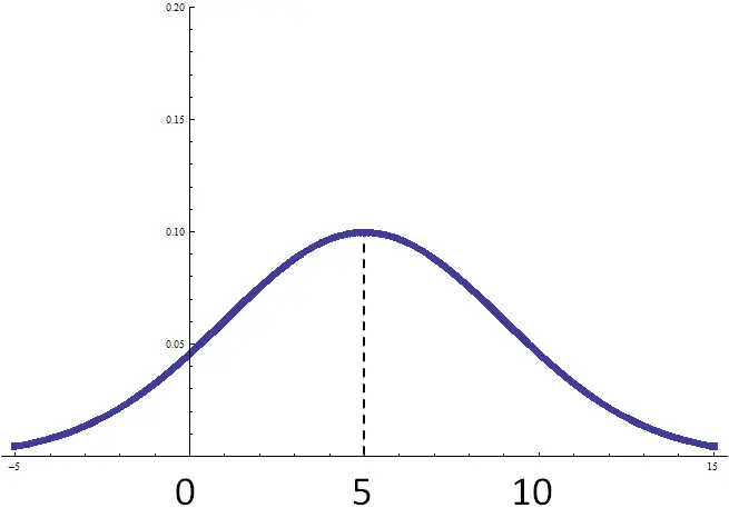 下の図は、$\mu=5$, $\sigma=4$ の場合の正規分布である。
