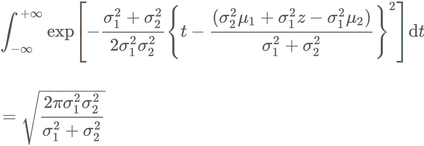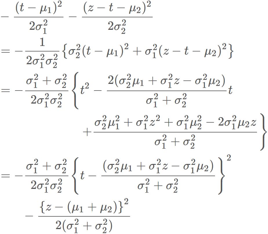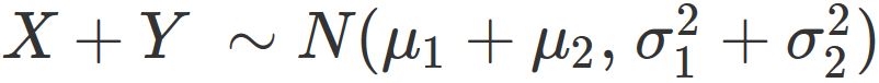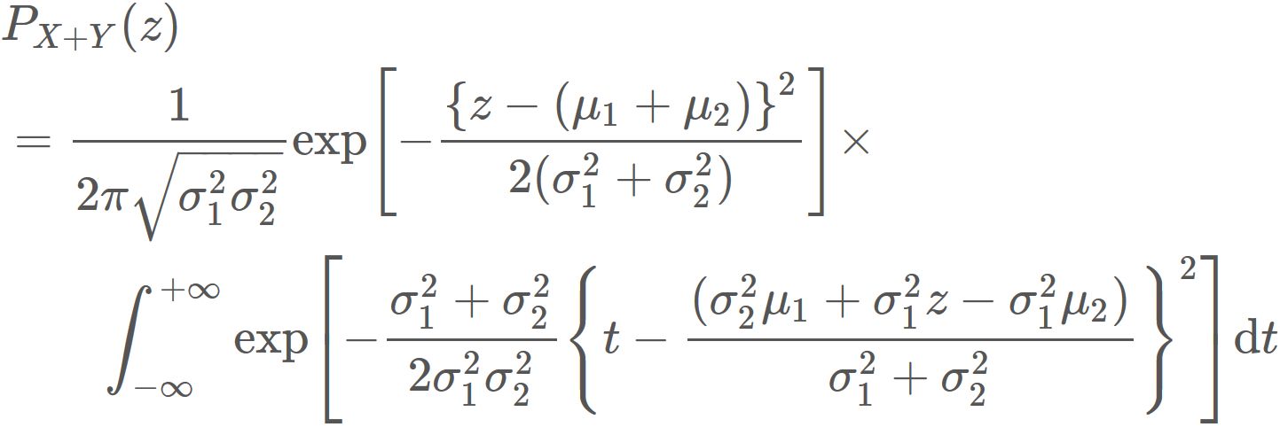 従って、確率変数 $X+Y$ は、期待値が $\mu_{1} + \mu_{2}$、分散が $\sigma_{1}^2 + \sigma_{2}^2$ の正規分布に従う。すなわち、