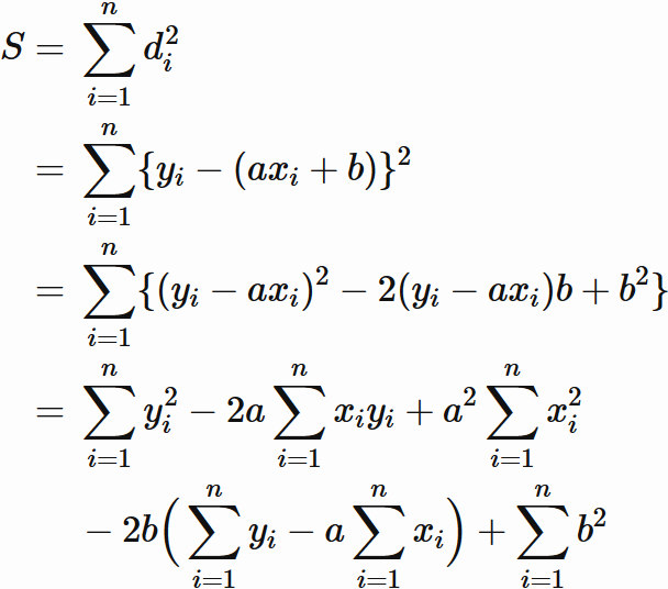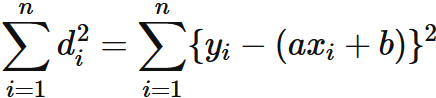 ここでは $y$ 座標値の差 $d_{i}$ の二乗の総和を最小にする直線を回帰直線と呼んでいるが、