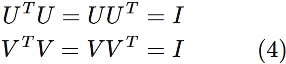 $U$ と $V$ は、直交行列であること $(4)$ により、
