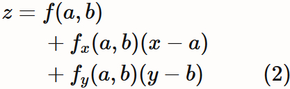 平面 $(2)$ は点 $(a,b, f(a,b))$ 上での関数 $f(x,y)$ の接平面である。