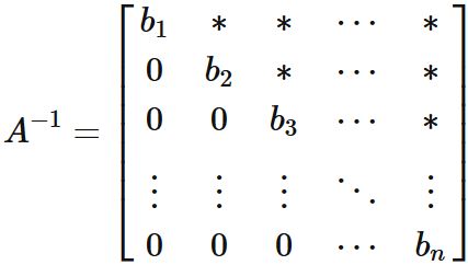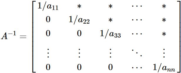 すなわち、$A^{-1}$ は対角成分が $A$ の対角成分の逆数に等しい上三角行列である。